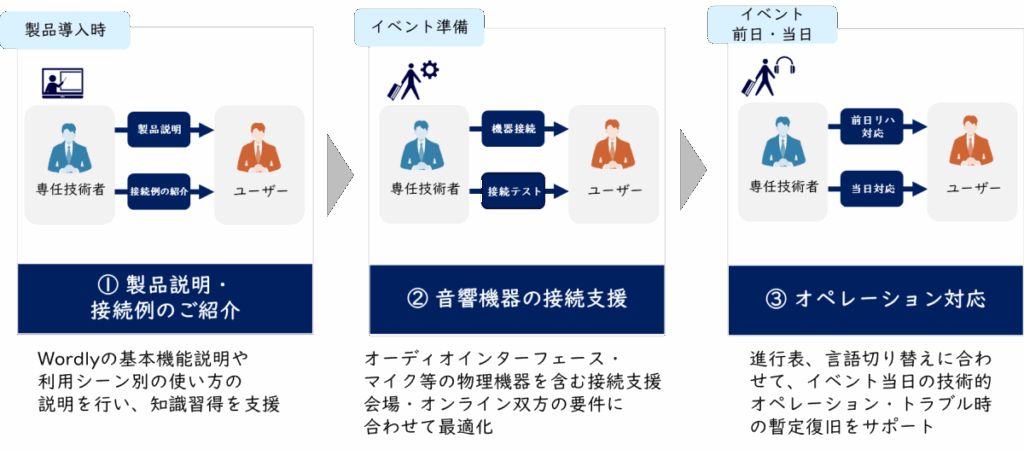 本サービスは、Wordlyに関する説明や利活用支援だけでなく、会場の接続支援や当日の技術運用までを含めた一貫対応を提供する点に特徴があります。