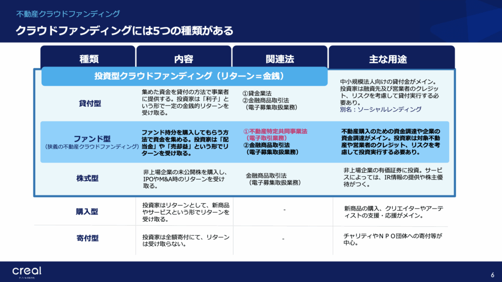 投資型には「株式型」「ファンド型」「貸付型」の3種類があります。