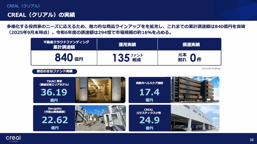 CREALは市場の黎明期から参入していて、累計で840億円以上の資金調達を達成しているほか、合計で135本のファンドを組成し、いずれも目標利回りをしっかりと達成している状況です。