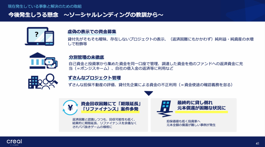 というのも、過去のソーシャルレンディングで発生した事故では情報開示の不十分さや分別管理の不徹底、杜撰なプロジェクト管理などが原因で投資家が大きな被害を被った事例が頻発したからです。