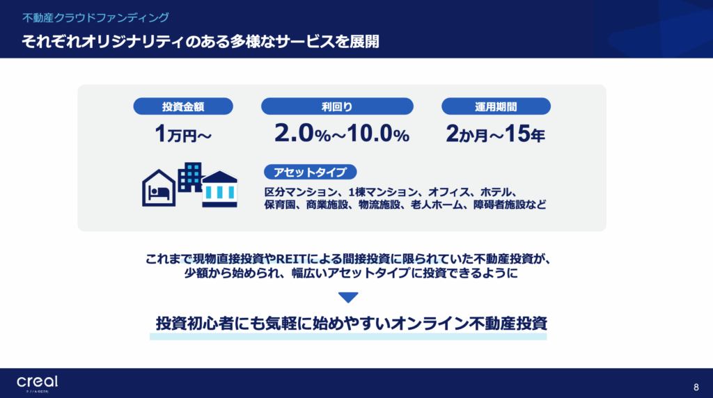 近年では、さまざまな企業がこの分野に参入しており、各社がそれぞれの強みを活かした独自性のあるサービスや商品設計を展開しています。不動産の種類(アセットタイプ)や運用方法、利回りなども多様化が進み、より幅広い投資家が参加しやすい市場へと発展しつつあります」(横田氏、以下同)