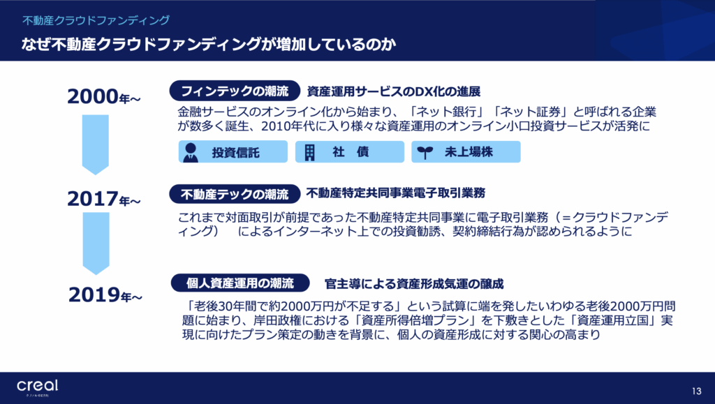その流れのなかで、不動産分野にも同様のオンライン化の波が押し寄せ、2017年の不動産特定共同事業法(不特法)改正を契機に、「これまで対面が前提だった不動産投資の勧誘や契約行為が、オンライン上で完結できるようになったことが、市場拡大の追い風になった」と横田氏は語りました。