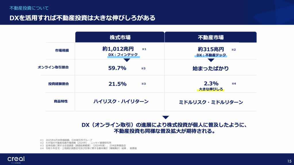 しかし、株式投資の経験者が21%に達していることを考えると、「不動産投資は今後DXの力を活用することで、10倍規模に拡大していく潜在力を秘めている」と横田氏は述べました。