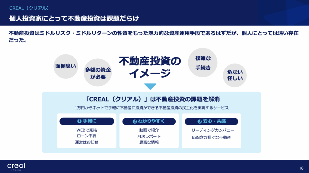 CREALは手軽さ、わかりやすさ、安心感、共感の4つを軸に不動産クラウドファンディングの仕組みを提供するサービスです。
