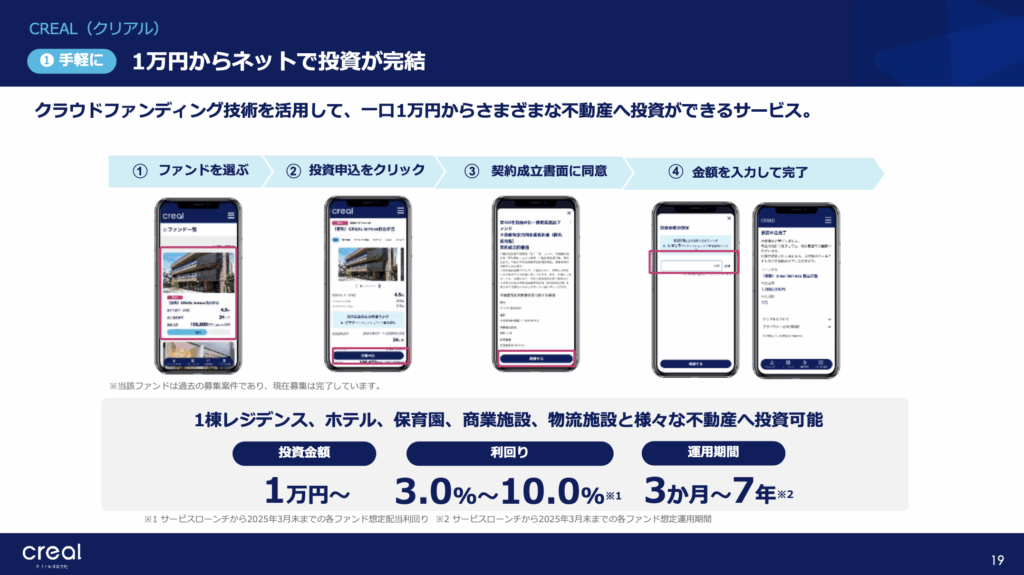 本人確認(KYC)をはじめとする必要なプロセスも、スマートフォンひとつで完結し、1口1万円から不動産に投資できる点が大きな魅力となっています。