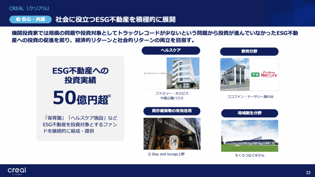 そのほか、CREALが重視しているのは社会課題の解決に資する社会インフラ型アセット「ESG不動産」への投資です。