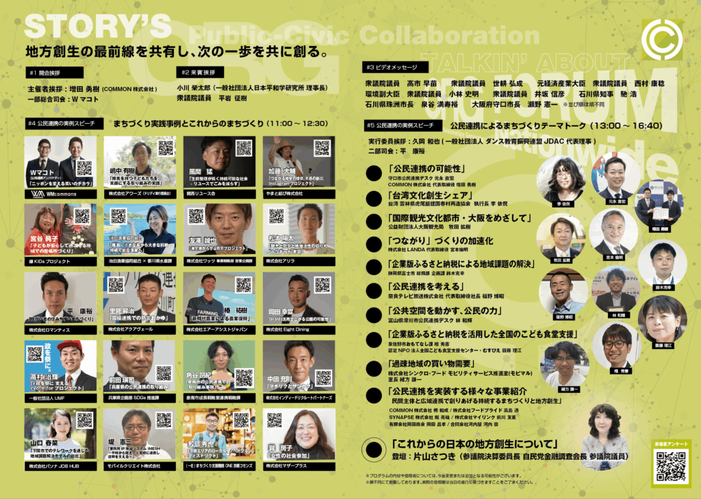 その最前線で実践を重ねるのがCOMMON株式会社です。公民連携フォーラムやコモンズコネクト(ネットワーク形成)、公民連携ラボや地域イベント支援などを通じて、地域資源を活かした課題解決型の事業を推進。