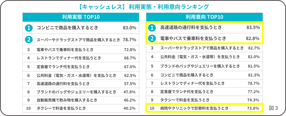 特に交通手段へのキャッシュレス需要は極めて高く、「高速道路の通行料を支払うとき」83.5%、「電車やバスで乗車料を支払うとき」82.8%と、8割台で上位を独占した。