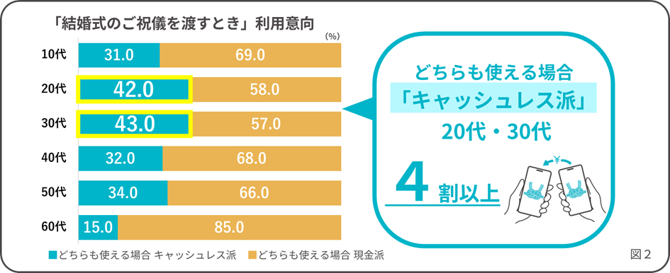 この世代では、実に4割超が「結婚式のご祝儀を渡すとき」にキャッシュレスを選択したいと回答。これは、他年代の比率(60代は15.0%)を大きく上回る。