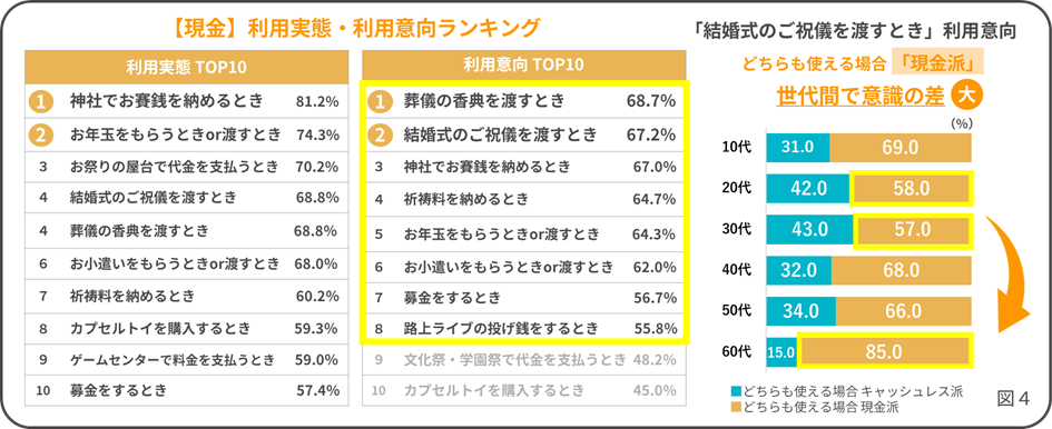 ご祝儀、香典、お年玉といった儀礼的な支払いシーンにおいても、全体で3割以上がキャッシュレス利用意向を示した。