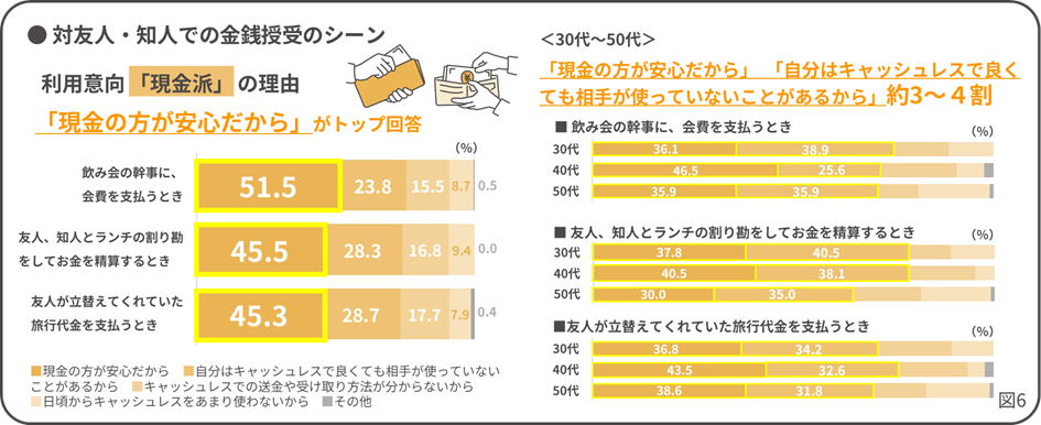このシーンで「現金派」を選ぶ理由として、「自分はキャッシュレスで良くても相手が使っていないことがあるから」という回答が、30代~50代で3~4割程度を占めた。