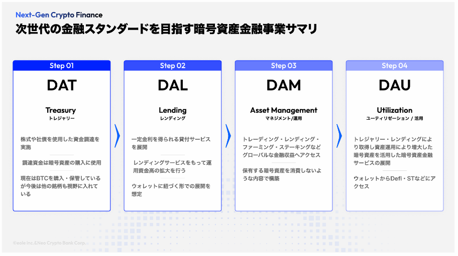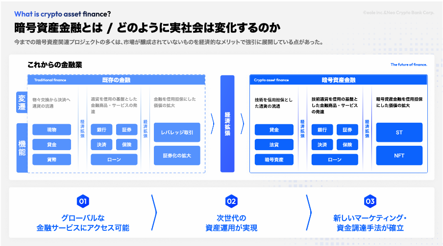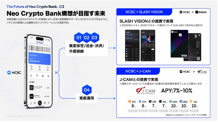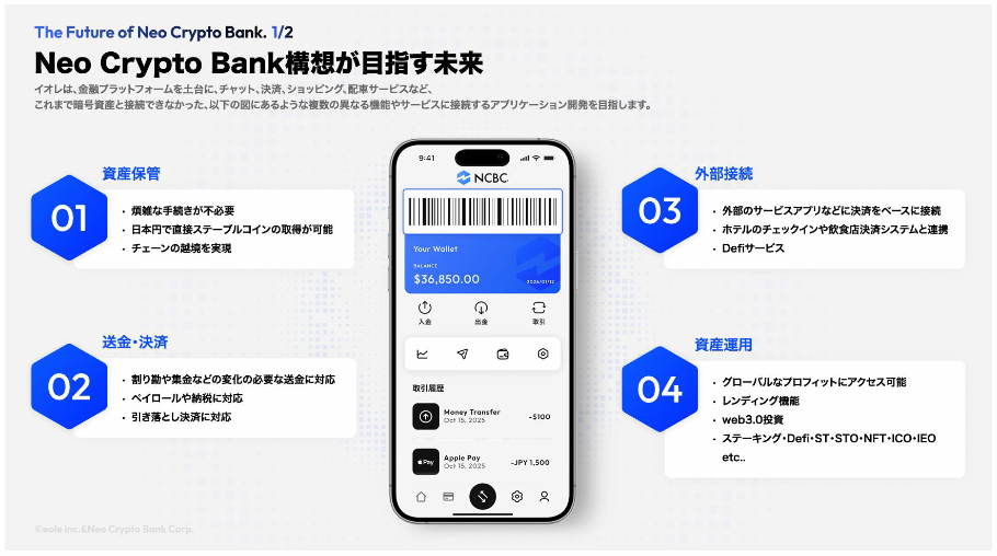 今回の発表会でイオレが提示したのは、「Neo Crypto Bank構想」と呼ばれる次世代金融インフラのビジョン。